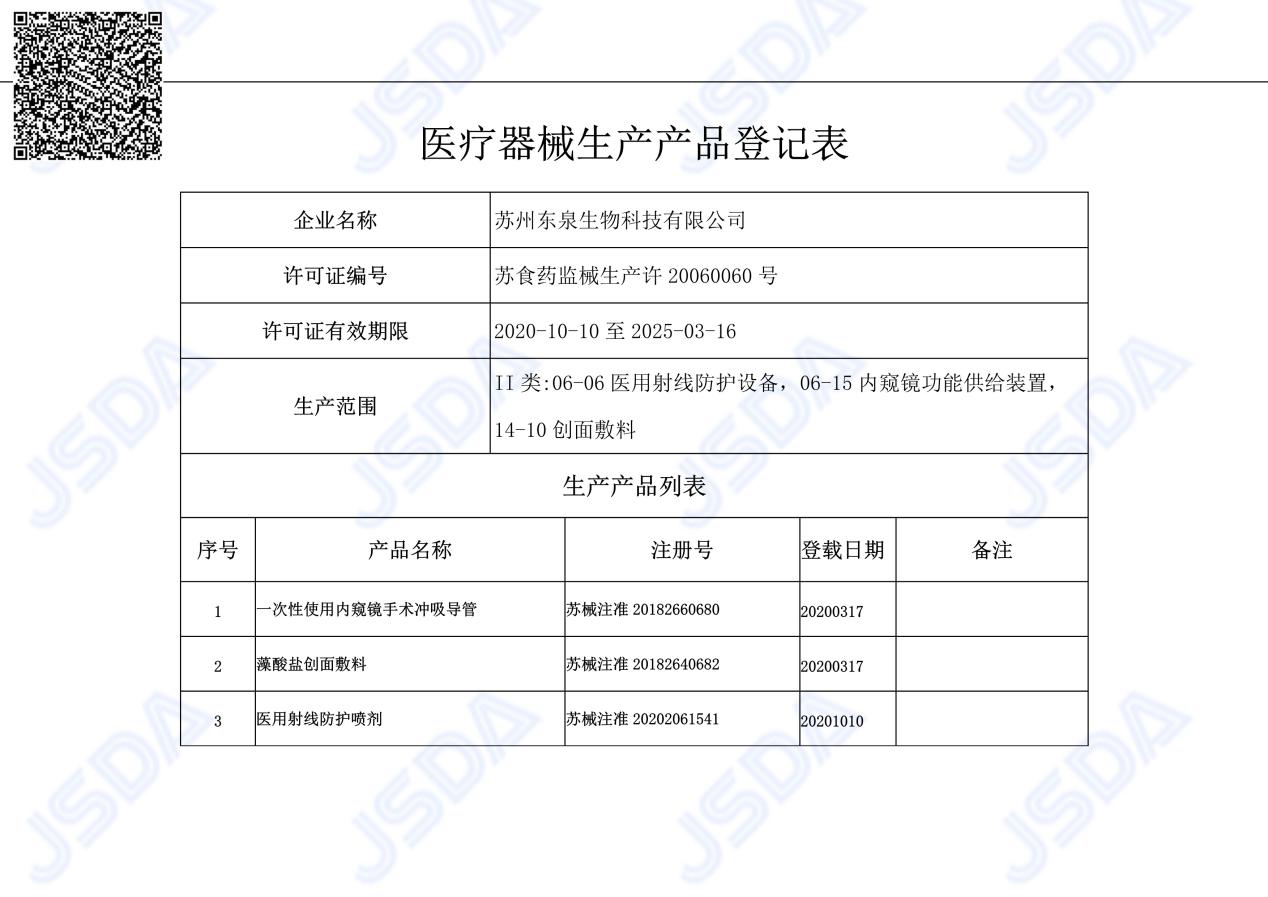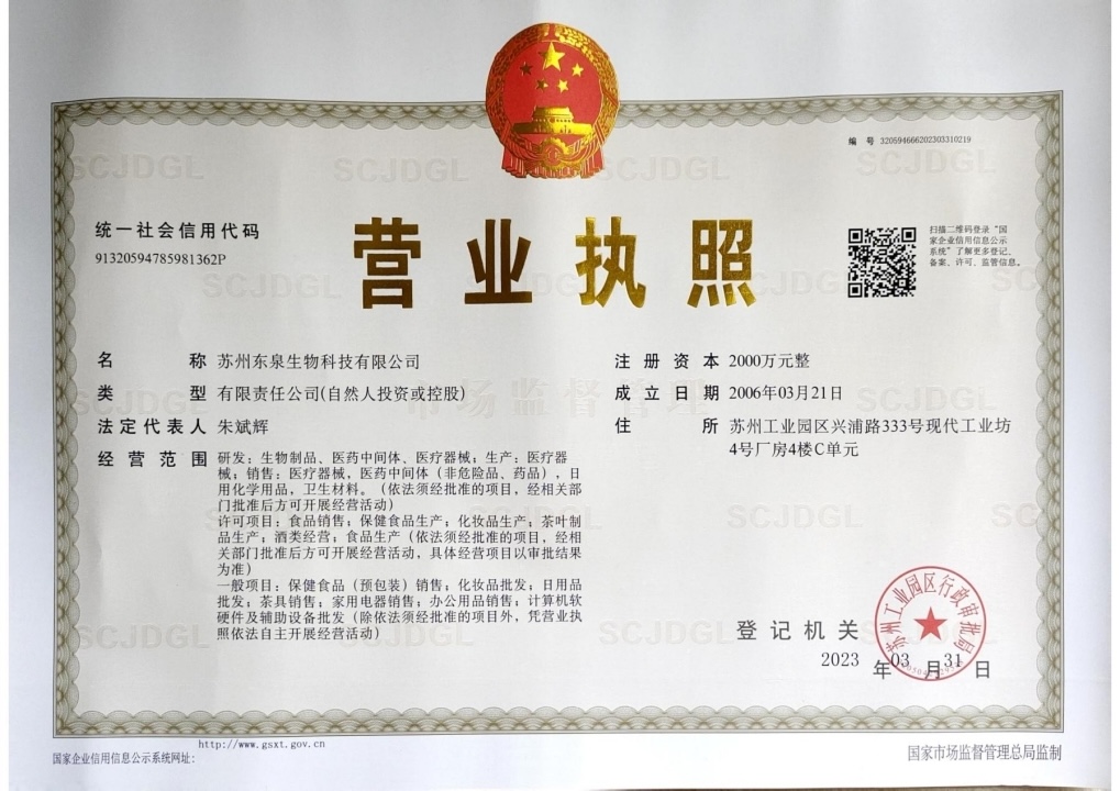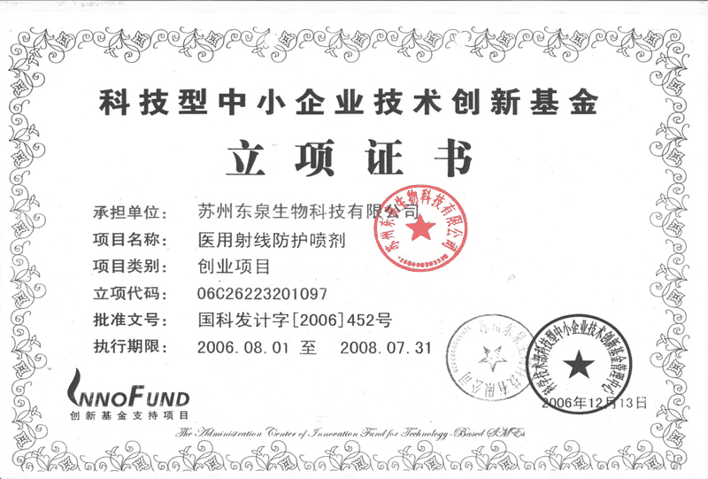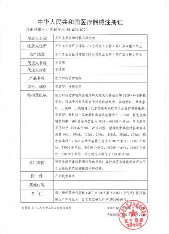 蘇州東泉生物科技有限公司創(chuàng)建于2006年,現(xiàn)位于蘇州工業(yè)園區(qū),是專業(yè)從事醫(yī)療器械產(chǎn)品研發(fā)、生產(chǎn)、銷售的高新技術(shù)企業(yè),也是國內(nèi)較早開展自由基清除劑超氧化物歧化酶(SOD)的生物效應(yīng)研究,并對超氧化物歧化酶進(jìn)行了純化研究的企業(yè)。企業(yè)研發(fā)生產(chǎn)的高新技術(shù)產(chǎn)品 《醫(yī)用射線防護(hù)噴劑》,獲國家發(fā)明專利。