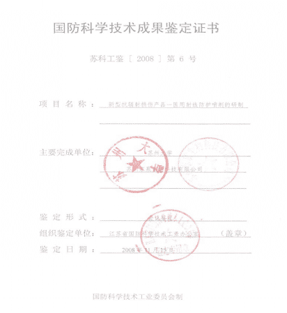 2. 經(jīng)江蘇省國防科學(xué)技術(shù)工業(yè)辦公室鑒定:該項(xiàng)目具有創(chuàng)新性,處于國內(nèi)領(lǐng)先水平。獲得《國防科學(xué)技術(shù)成果鑒定證書》