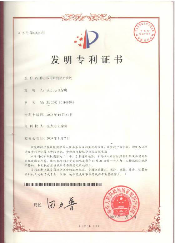 醫(yī)用射線防護(hù)噴劑發(fā)明專利證書