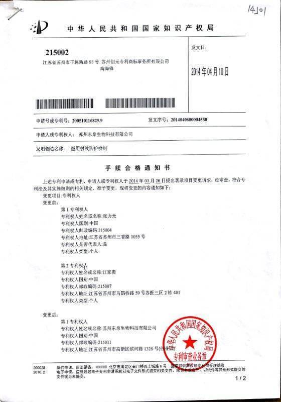 醫(yī)用射線防護(hù)噴劑手續(xù)合格通知書正面
