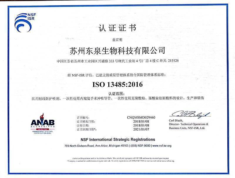 1. 企業(yè)經(jīng)NSF-ISR評(píng)估,已建立的質(zhì)量管理體系符合國際管理體系標(biāo)準(zhǔn),于2018年1月8日獲《ISO13485:2016認(rèn)證證書》 。