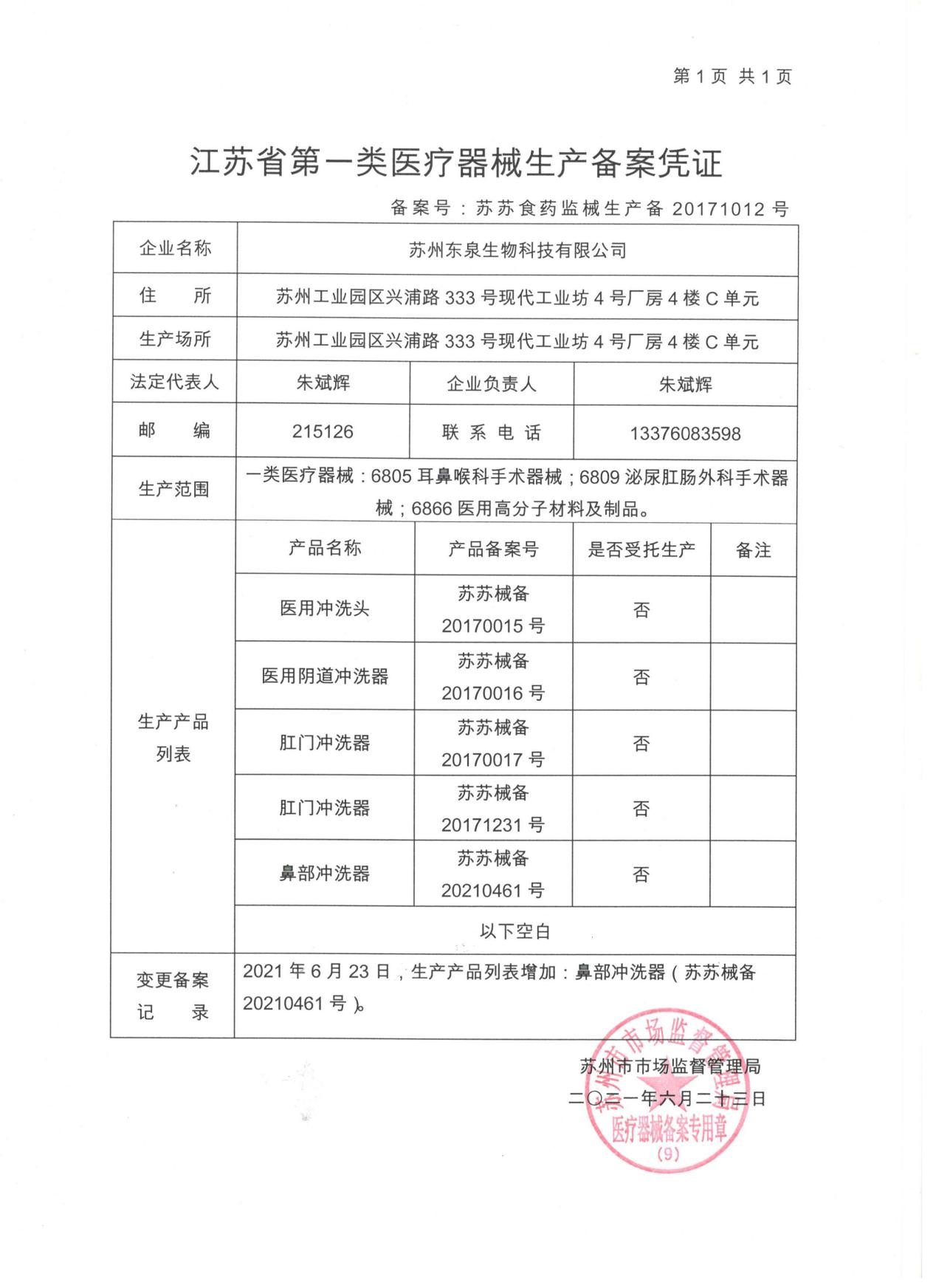 江蘇省第一類醫(yī)療器械生產(chǎn)備案憑證