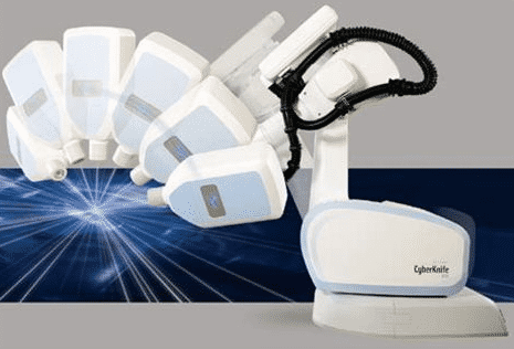 射波刀(賽博刀)是一種加載在萬向旋轉(zhuǎn)機(jī)器臂上的小型加速器,它不僅可以進(jìn)行多角度照射,更重要的是它在專門的呼吸監(jiān)控和治療引導(dǎo)的幫助下,治療精準(zhǔn)度更高,誤差更小。由于機(jī)械精度非常高,它可以幫助醫(yī)生安全地做大劑量、低分次的治療。因?yàn)槭褂玫氖俏⑿图铀倨?,所以照射照射范圍比較小。射波刀的精確度使得醫(yī)生可以安全地使用大劑量照射,周邊健康組織受到的損傷更小,患者一般只需要1到5次即可完成治療。